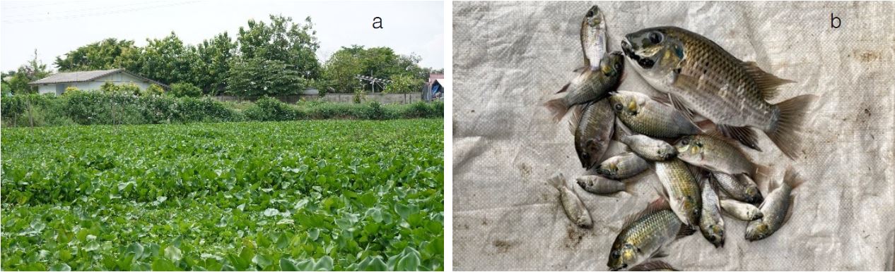 ภาพ 1 ตัวอย่างชนิดพันธุ์ต่างถิ่นที่รุกราน a. ผักตบชวา (Pontederia crassipes Mart.)