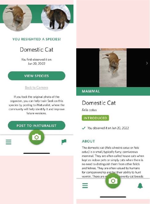 เมื่อกดถ่ายภาพสิ่งมีชีวิตหรือใช้คำสั่ง Identify Photo แล้ว รูปภาพที่วิเคราะห์มีความคมชัดเพียงพอที่ระบบสามารถวิเคราะห์ได้ ระบบจะแสดงข้อมูลการระบุสปีชีส์สิ่งมีชีวิต และสามารถกดดูข้อมูลทางชีววิทยา การจำแนกทางอนุกรมวิธานด้วยการกดคำสั่ง View Species และถ้าสิ่งมีชีวิตดังกล่าวเป็นชนิดพันธุ์ต่างถิ่น ระบบจะแสดงคำว่า Introduced ประกอบ ดังภาพ 4 นอกจากนี้ ถ้าผู้ใช้งานมีรหัสสมาชิกเป็นผู้ใช้งานระบบ iNaturalist สามารถแบ่งปันรูปภาพลงฐานข้อมูลของ iNaturalist ได้ โดยกดที่คำสั่ง Post to iNaturalist ซึ่งจะมีผู้เชี่ยวชาญจากทั่วโลกมาช่วยยืนยันผลการระบุสปีชีส์ด้วยอีกทาง ในกรณีที่ผู้ใช้งานพบว่าระบบระบุสปีชีส์ผิดพลาด สามารถกดที่ไอคอน เพื่อลบข้อมูลสิ่งมีชีวิตออกจากรายการสำรวจได้ทันที ทั้งนี้ ในกรณีที่ระบบไม่สามารถวิเคราะห์รูปได้ อาจลองเปลี่ยนมุมการถ่ายรูปสิ่งมีชีวิต และถ่ายรูปให้มีความคมชัดมากขึ้น หรือใช้คำสั่ง Post to iNaturalist เพื่อให้ผู้เชี่ยวชาญจากทั่วโลกมาร่วมกันวิเคราะห์และระบุสปีชีส์จากรูปแทน