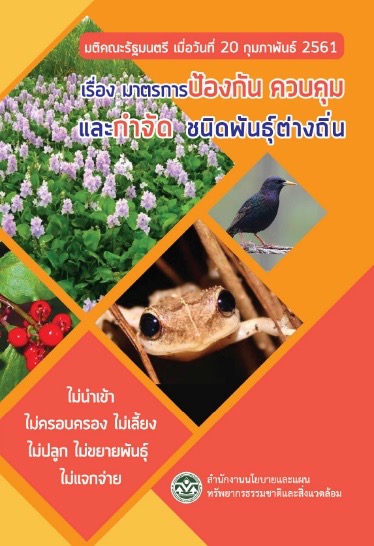 สำนักงานนโยบายและแผนทรัพยากรธรรมชาติและสิ่งแวดล้อม. (2561). มติคณะรัฐมนตรี เมื่อวันที่ 20 กุมภาพันธ์ 2561 เรื่อง มาตรการป้องกัน ควบคุม และกำจัดชนิดพันธุ์ต่างถิ่น. สืบค้นเมื่อ 21 พฤษภาคม 2566, จาก https://www.onep.go.th/ebook/bio/mati-20feb2561-alien-species.pdf