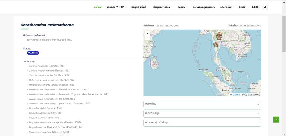 สำนักงานนโยบายและแผนทรัพยากรธรรมชาติและสิ่งแวดล้อม. (2564). ระบบคลังข้อมูลความหลากหลายทางชีวภาพของประเทศไทย THAILAND BIODIVERSITY INFORMATION FACILITY (TH-BIF). สืบค้นเมื่อ 21 พฤษภาคม 2566, จาก https://thbif.onep.go.th/