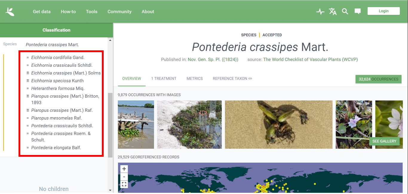 ภาพ 11 ตัวอย่างผลการสืบค้นข้อมูลจากคลังข้อมูล GBIF ของผักตบชวา และข้อมูลชื่อพ้องของผักตบชวา (ในกรอบสีแดง)