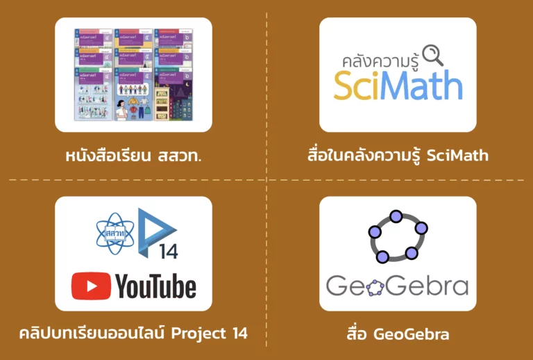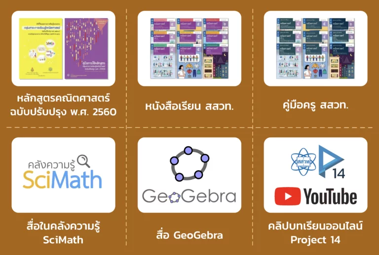 - แหล่งรวบรวมสื่อประกอบการเรียนรู้ รายวิชาคณิตศาสตร์ ระดับมัธยมศึกษาตอนปลาย ซึ่งรวบรวมลิงก์ไปยังเว็บไซต์สั่งซื้อหนังสือเรียน สื่อประกอบการเรียนรู้คณิตศาสตร์ในคลังความรู้ SciMath วีดิทัศน์บทเรียนออนไลน์จากโครงการสอนออนไลน์ Project 14 และสื่อ GeoGebra ประกอบการเรียนรู้คณิตศาสตร์ รวมทั้งหลักสูตรและคู่มือครูสำหรับคุณครู