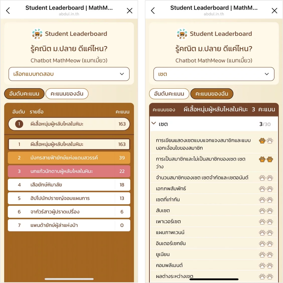 - ชื่อที่ปรากฏในหน้าแสดงคะแนนของนักเรียนเป็นชื่อที่แสดง ซึ่งนักเรียนเลือกตอนลงทะเบียนครั้งแรก