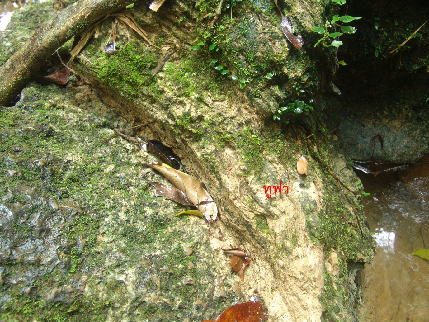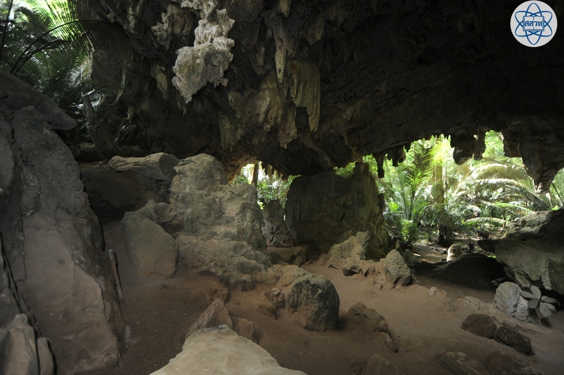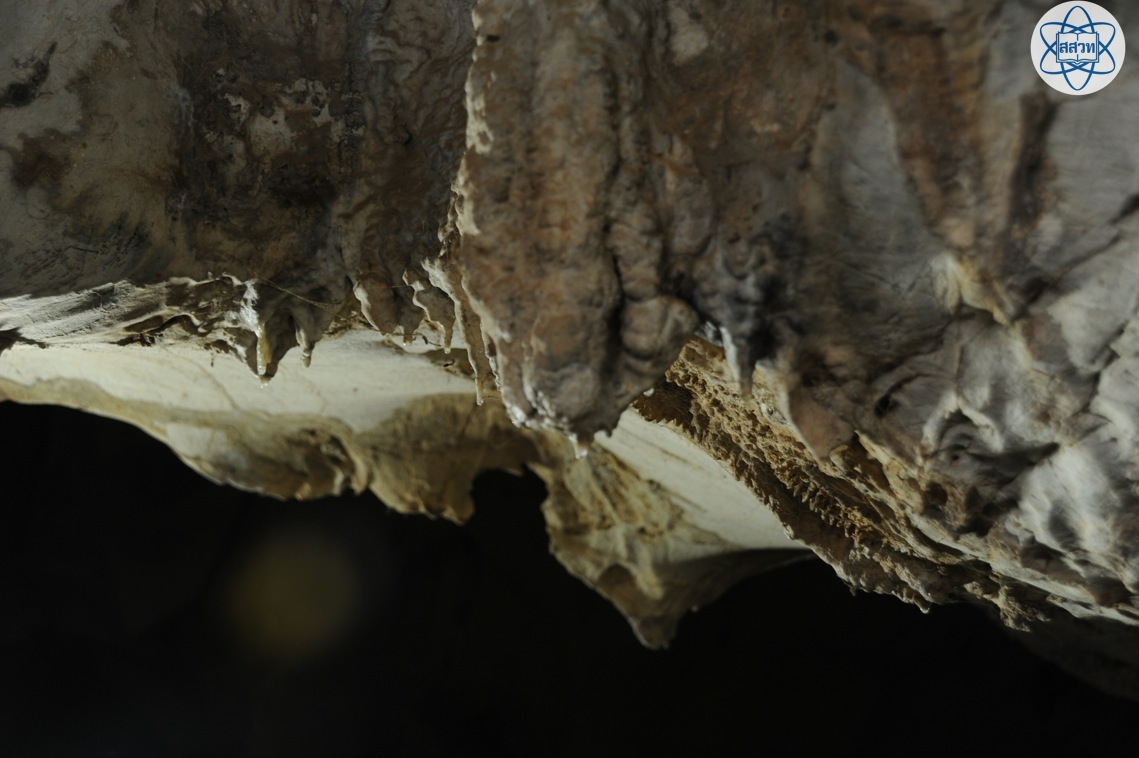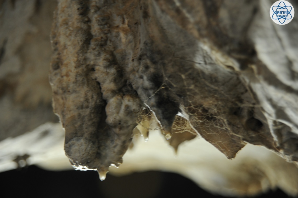 ภาพ 7.1 หินย้อย และหินย้อยที่เกิดเป็นแผ่นเป็นหินปูนที่เกิดจากน้ำ ที่ซึมจากเพดานถ้ำบ่อยครั้งที่บริเวณเพดานถ้ำมีรอยแตกเป็นเส้นตรง