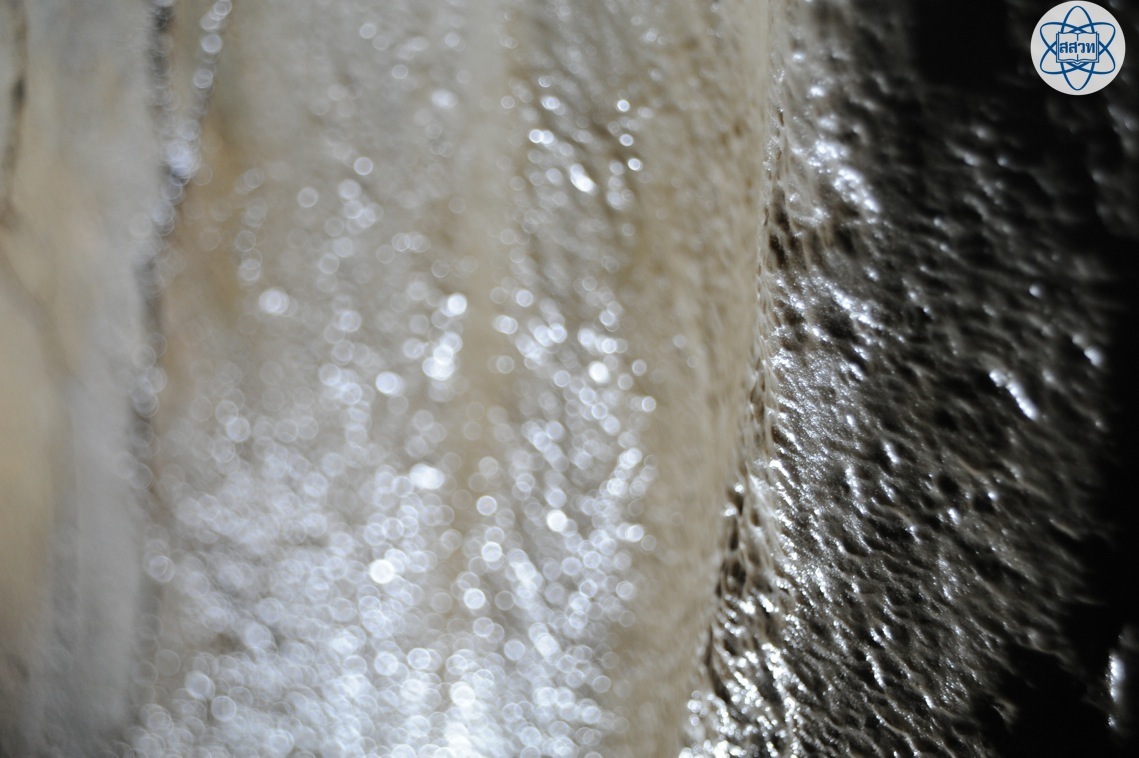 ยังบริเวณผนังถ้ำด้านข้าง การไหลของน้ำจะทำให้เกิดการตกผลึกของแร่คาร์บอเนต