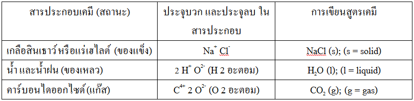 - กรณีที่สารประกอบเคมีประกอบด้วยธาตุ 2 ชนิด เช่น เกลือแกง น้ำ และแก๊สคาร์บอนไดออกไซด์สารประกอบจะประกอบด้วย ประจุบวก และประจุลบ ให้เขียนองค์ประกอบประจุบวกก่อน และตามหลังด้วยองค์ประกอบประจุบ แสดงในตาราง 3