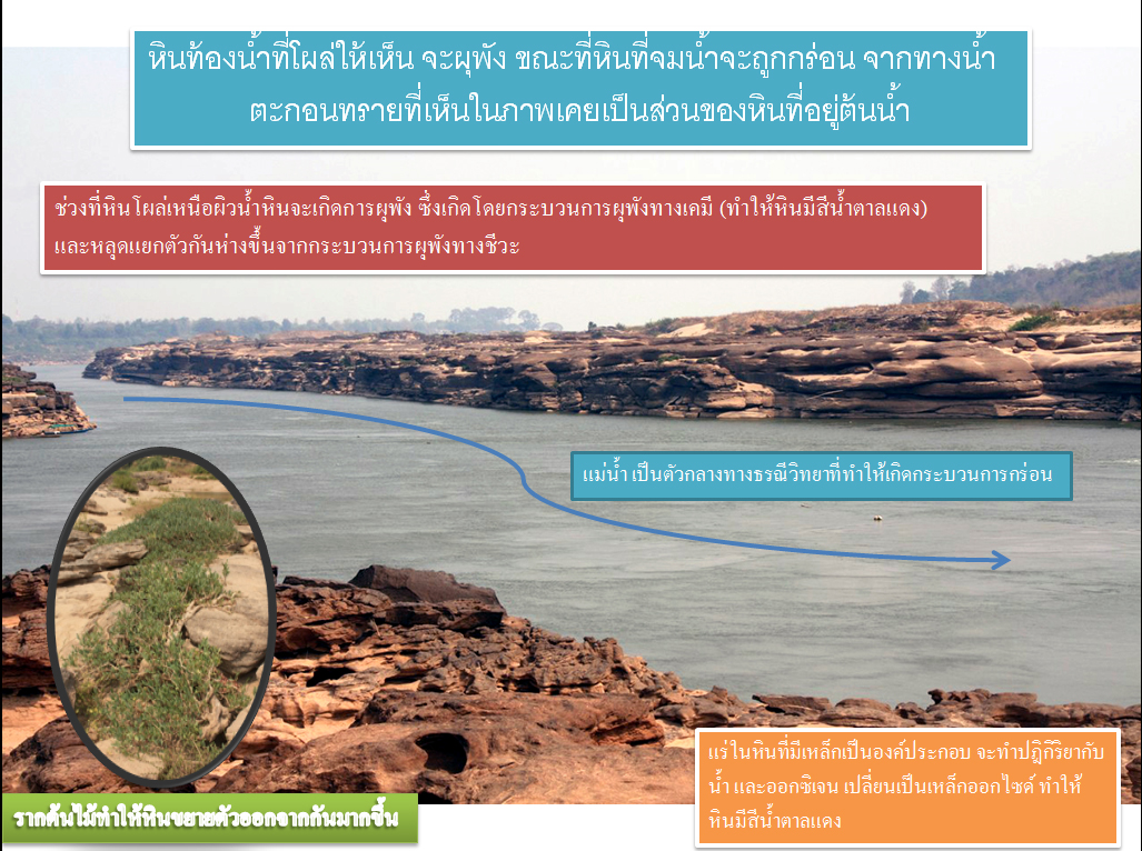 ภาพ 1: กระบวนการผุพัง กระบวนการกร่อน และการตกตะกอนที่เกิดขึ้นกับหินตะกอนที่โผล่บริเวณผิวโลก ภาพถ่ายแม่น้ำโขง บริเวณสามพันโบก จังหวัดอุบลราชธานี