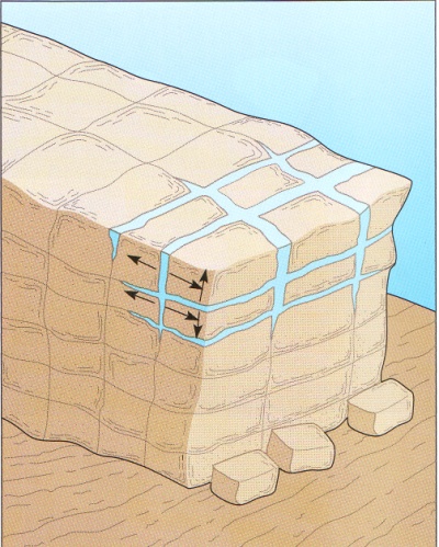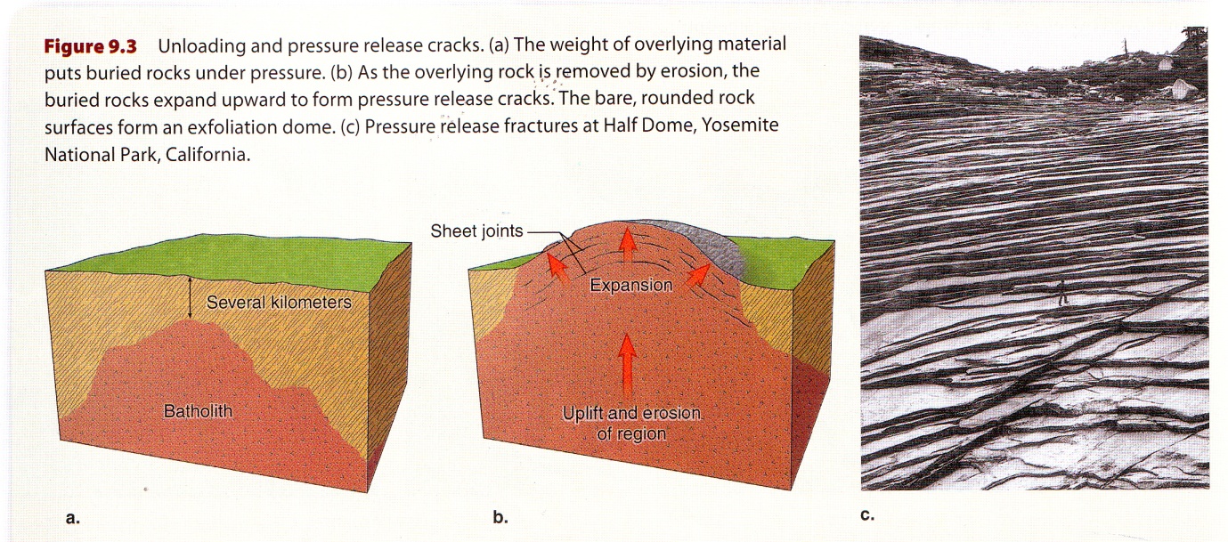 - การยกตัวของเปลือกโลก และการกร่อน ทำให้หินที่หินโผล่บริเวณผิวโลก หรืออยู่ใต้ผิวโลกในระดับความลึกที่ไม่มากนัก หินที่โผล่จะมีการปรับตัวให้เข้ากับสภาพแวดล้อมใหม่ ที่มีความดันลดลง ทำให้หินเกิดรอยแตก