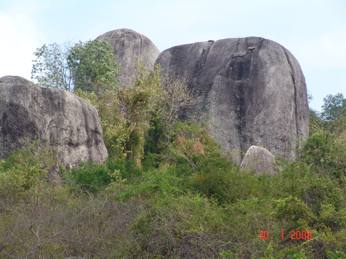 ภาพ 3: หินแกรนิต แสดงลักษณะการผุพัง เป็นก้อนกลมมน (แกรนิต บริเวณ ตำบลห้วยทราย อำเภอเมือง จังหวัดประจวบคีรีขันธ์)