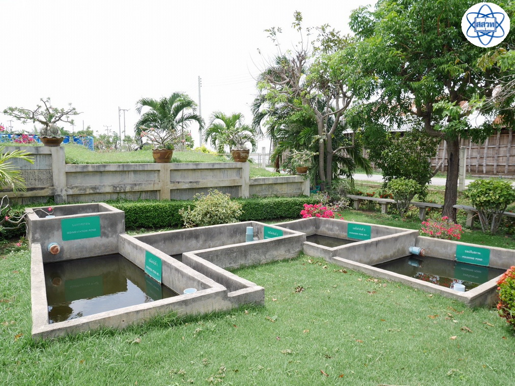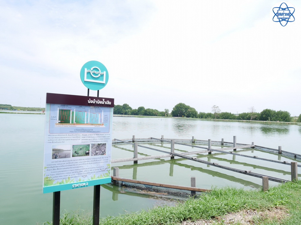 ระบบบ่อบำบัดน้ำเสีย เป็นระบบที่ใช้การกักพักน้ำเสียเอาไว้ในบ่อบำบัดเป็นระยะเวลาที่เหมาะสมกับปริมาณความสกปรกของน้ำ ระบบบ่อบำบัดใช้การเติมออกซิเจนด้วยกระบวนการสังเคราะห์แสงของแพลงก์ตอนและสาหร่ายเพื่อให้จุลินทรีย์หายใจและย่อยสลายสารอินทรีย์ (Organic matter) ในน้ำเสีย สามารถลดความสกปรกในรูปของค่า BOD ได้ถึงร้อยละ 85-90 ระบบบ่อบำบัดน้ำเสียของโครงการฯ มีทั้งหมด 5 บ่อ แบ่งเป็น 3 ประเภท ประกอบด้วย บ่อตกตะกอน จำนวน 1 บ่อ บ่อผึ่ง จำนวน 3 บ่อ และบ่อปรับสภาพ จำนวน 1 บ่อ โดยการออกแบบบ่อบำบัดให้มีความลาดชัน 1:1000 ต่อต้นแบบอนุกรม แต่ละบ่อใช้ระยะเวลากักพักน้ำเสียโดยประมาณ 7 วัน เพื่อช่วยในการฆ่าเชื้อโรค และให้น้ำเสียเติมเต็มทุกวัน น้ำเสียของแต่ละบ่อจะไหลล้นจากด้านบนและไหลเข้าสู่ด้านล่างของบ่อถัดไป