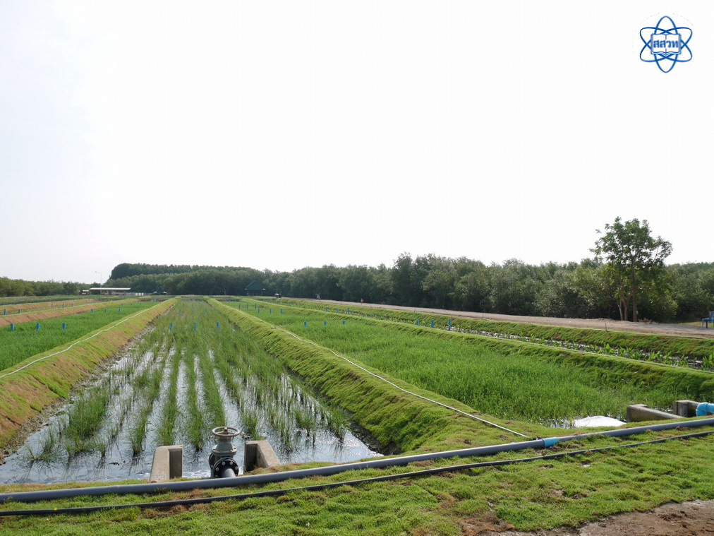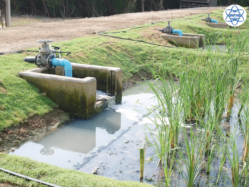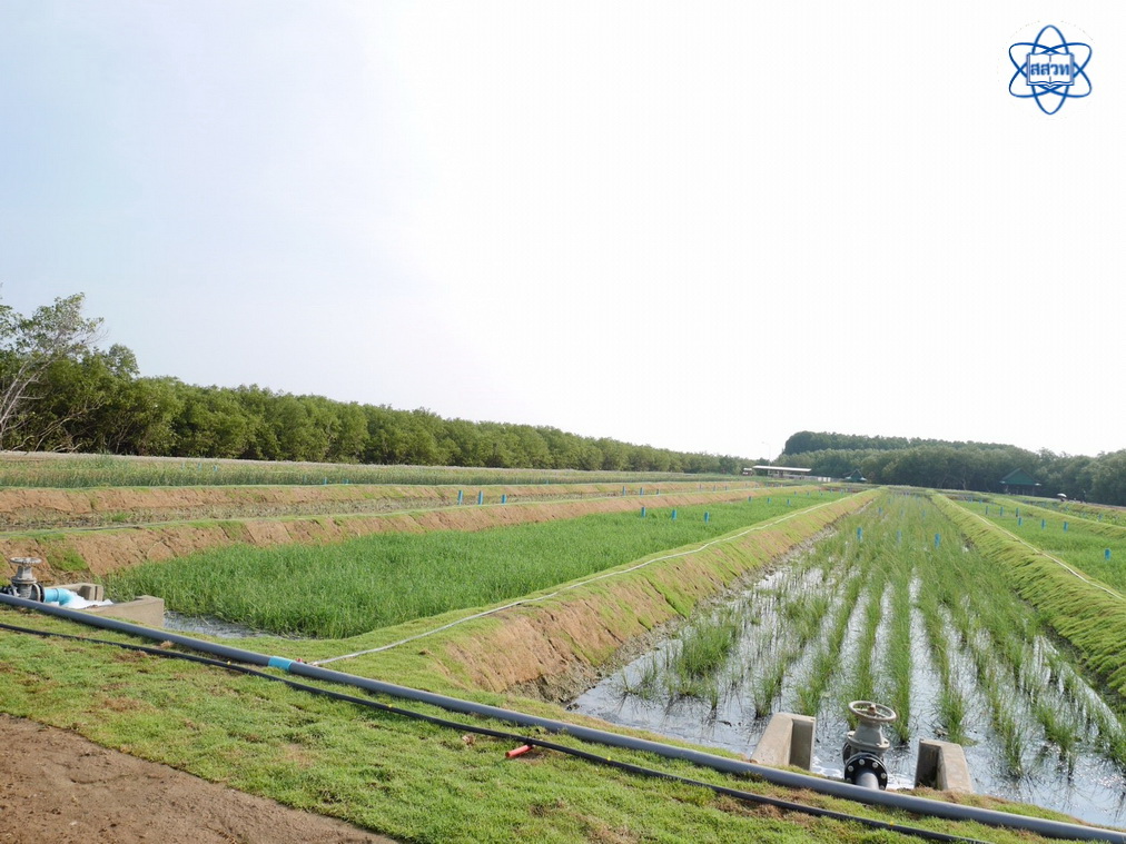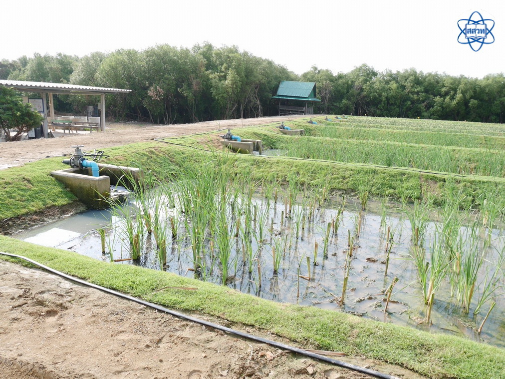 น้ำเสียที่เกิดจากชุมชนเป็นน้ำเสียที่ประกอบไปด้วยธาตุไนโตนเจน ฟอสฟอรัส และโพแทสเซียม ดังนั้นทางโครงการศึกษาวิจัยและพัฒนาสิ่งแวดล้อมแหลมผักเบี้ยอันเนื่องมาจากพระราชดำริ จึงได้มีการทดลองนำน้ำเสียจากชุมชนมาทำการปลูกข้าว โดยทางโครงการศึกษาวิจัยได้นำน้ำเสียจากชุมชนและน้ำจากระบบชลประทานในอัตราส่วน 50:50 มาใช้ในแปลงปลูกข้าว ซึ่งผลที่ได้พบว่าต้นข้าวมีการเจริญเติบโตได้ดียิ่งไปกว่านั้นผลผลิตที่ได้ยังสามารถนำไปใช้บริโภคได้ เนื่องจากน้ำเสียที่นำมาใช้นี้เป็นน้ำเสียจากชุมชนที่เมื่อถูกนำมาใช้และได้ทำการทดสอบค่าแล้วพบว่าสิ่งเจือปน ดังเช่น โลหะหนัก มีค่าไม่เกินค่าที่มาตรฐานกำหนด