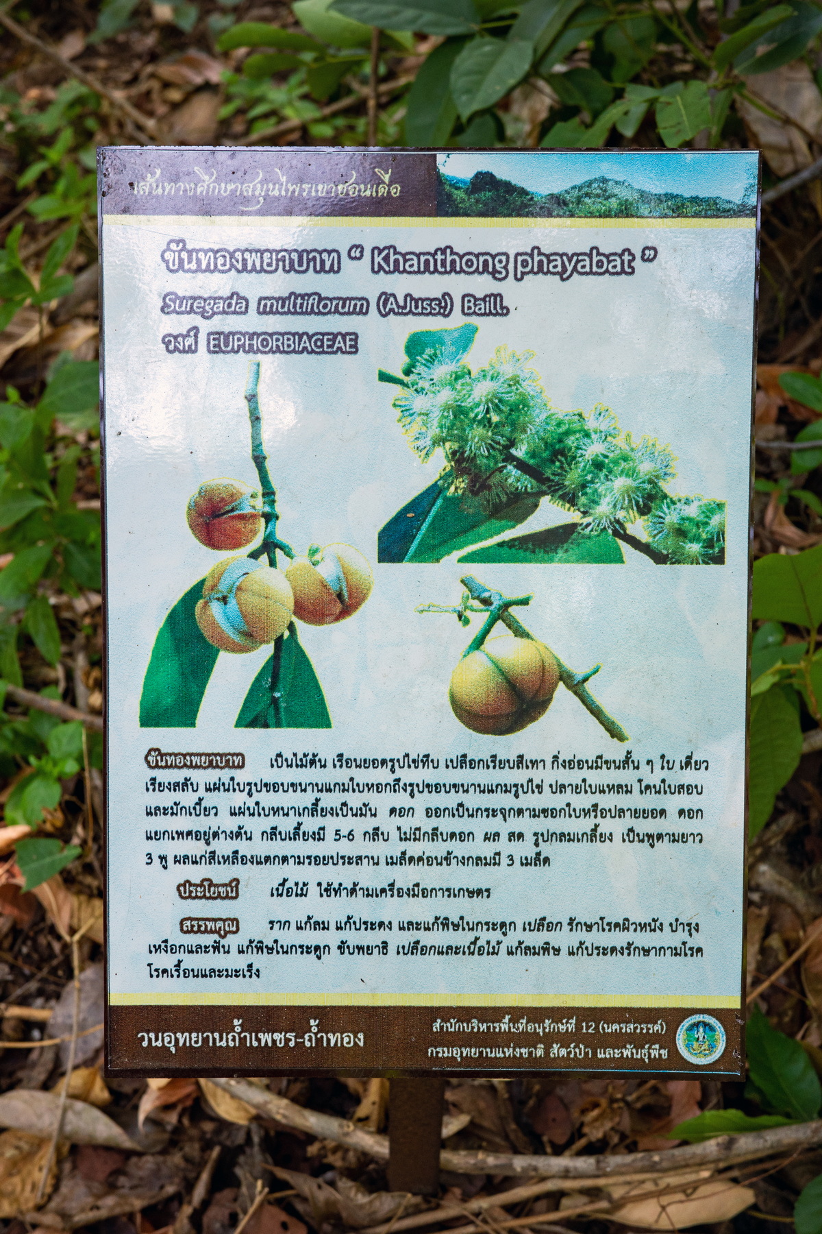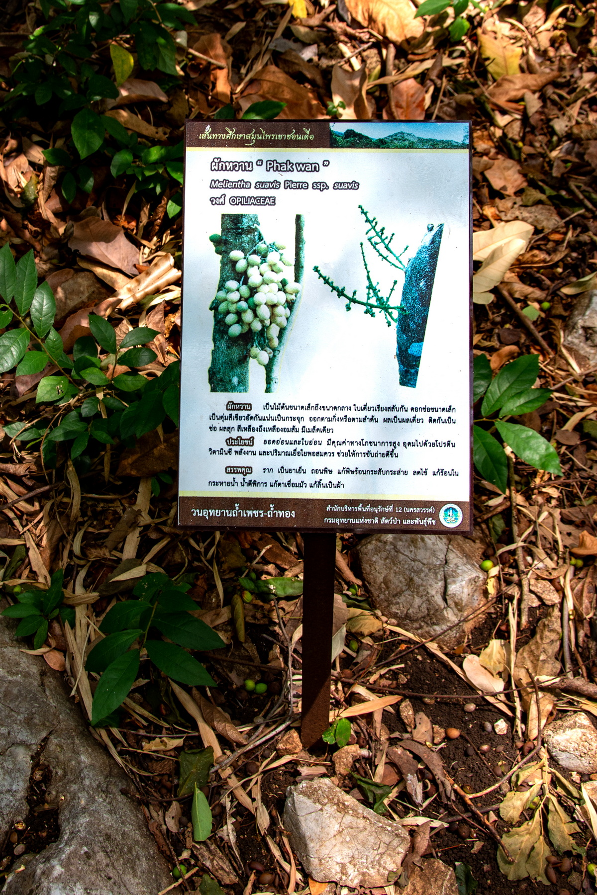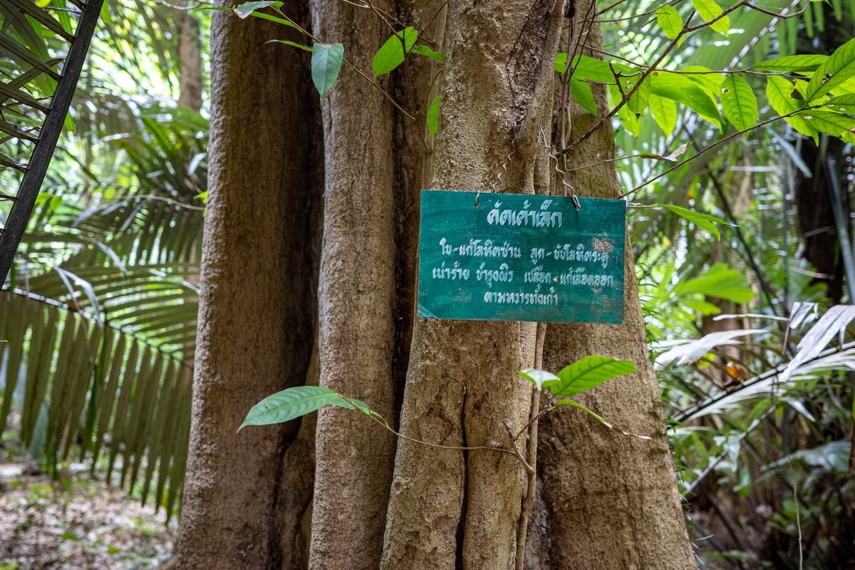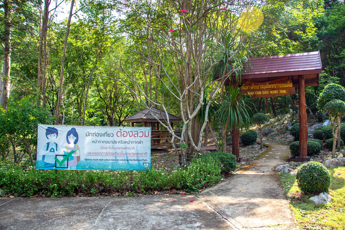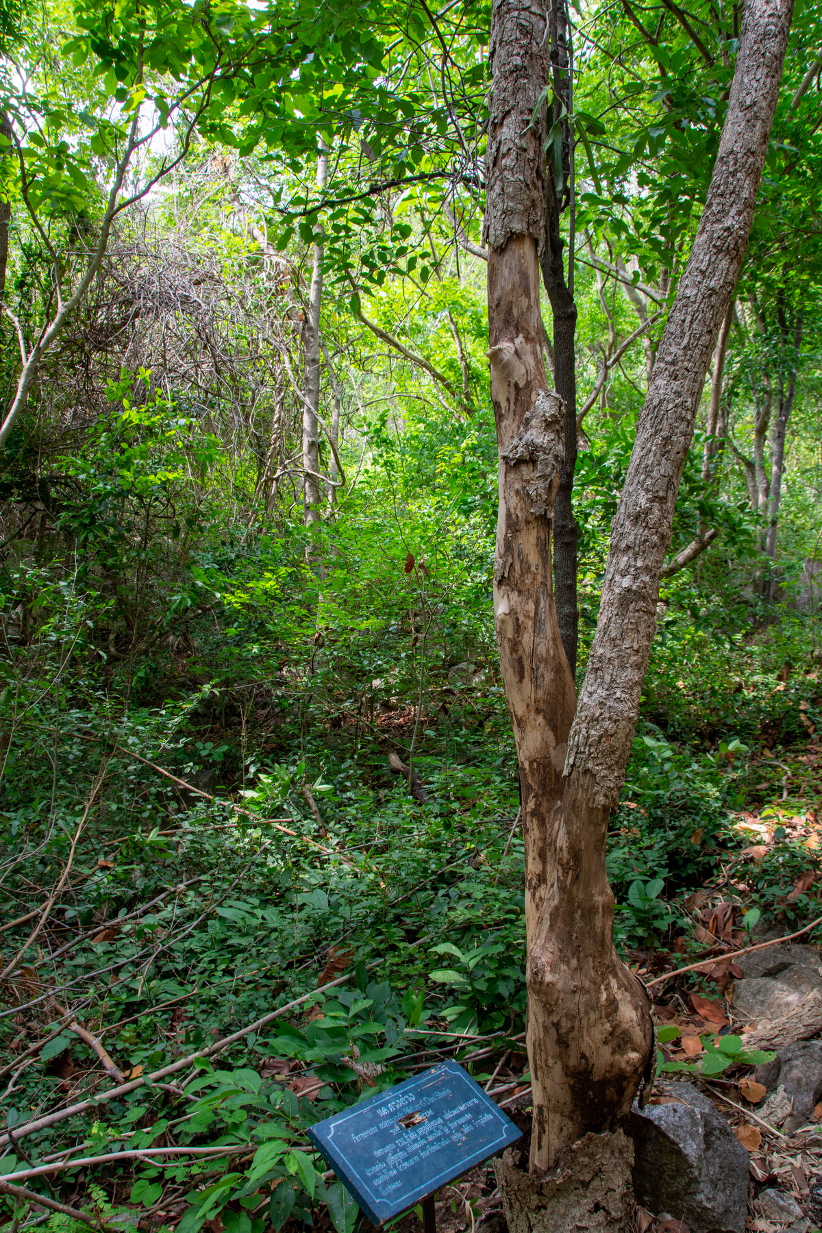 บัวสันโดษ หรือ ชื่อเรียกอื่นๆ แผ่นดินเย็น ว่านพระฉิม ชื่อทางวิทยาศาสตร์ Nervilia aragoana Gaud. จัดอยู่ในวงศ์ : ORCHIDACEAE เป็นไม้ล้มลุกลงหัวขนาดเล็ก ลำต้นงอกออกจากหัว ซึ่งเป็นสมุนไพรบำรุงกำลัง แก้โรคหัวใจ แก้จุกเสียดแน่นและแก้พิษไข้ ลักษณะพิเศษคือ จะออกส่วนของดอกก่อน เมื่อดอกโรยจะเป็นใบ ดังนั้นคนส่วนใหญ่จึงจะคุ้นกับบัวสันโดษที่เป็นใบแล้ว นอกจากนี้ยังมีพันธุ์ไม้และพืชสมุนไพรอีกมากมายหลายอย่าง เช่น กะเบาลิง สมพง ปออีเก้ง มะหาด มะไฟป่า สาบเสือ กระท่อมเขียว จันทน์ผา สลัดใด มะกา ซึ่งล้วนแต่เป็นพืชที่มีคุณสมบัติเป็นยาได้ จึงทำให้ที่นี่เป็นแหล่งเรียนรู้เกี่ยวกับพืชสมุนไพรอีกด้วย