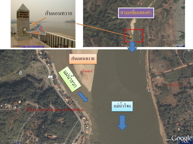 แม่น้ำโขงไหลมาสบกับแม่น้ำรวก ที่ บ้านสบรวก จังหวัดเชียงราย มีความเร็วลดลง ทำให้ตะกอนขนาดทราย ที่แม่น้ำโขงพามาเกิดการตกตะกอนเป็นสันดอนทราย (เกาะกลางแม่น้ำ)
