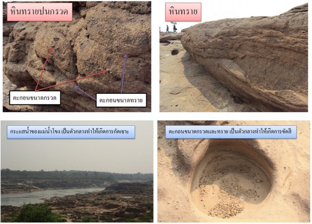 ตัวกลางในการกร่อน : แม่น้ำโขง โดยอาศัย แรงโน้มถ่วง กระแสน้ำ ที่ทำให้เกิดการกัดเซาะ และตะกอนขนาดกรวดและทราย ที่ทำให้เกิดการขัดสี