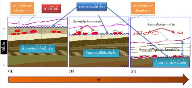- เมื่อเวลาผ่านไป แม่น้ำโขงกร่อนแผ่นดินมากขึ้น จนถึงชั้นหินตะกอนที่มีคาลซิโดนี เกิดร่วมด้วย