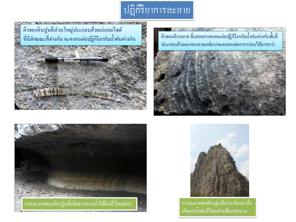 - ปฎิกิริยาการละลาย และปฎิกิริยาจากน้ำฝนที่เป็นกรดอ่อน เป็นปฎิกิริยาระหว่าง แร่ประกอบ หิน เป็นแร่ที่สามารถละลายน้ำได้ (แร่เฮไลต์ ในหินเกลือ หรือแร่ยิปซัม ในหินยิปซั่ม) หรือแร่แคลไซต์ ในหินปูน เช่น เกลือสินเธาว์ และแร่ยิปซั่ม ที่ละลายโดยน้ำใต้ดิน หินปูน ที่ละลาย จากน้ำฝน และน้ำใต้ดิน