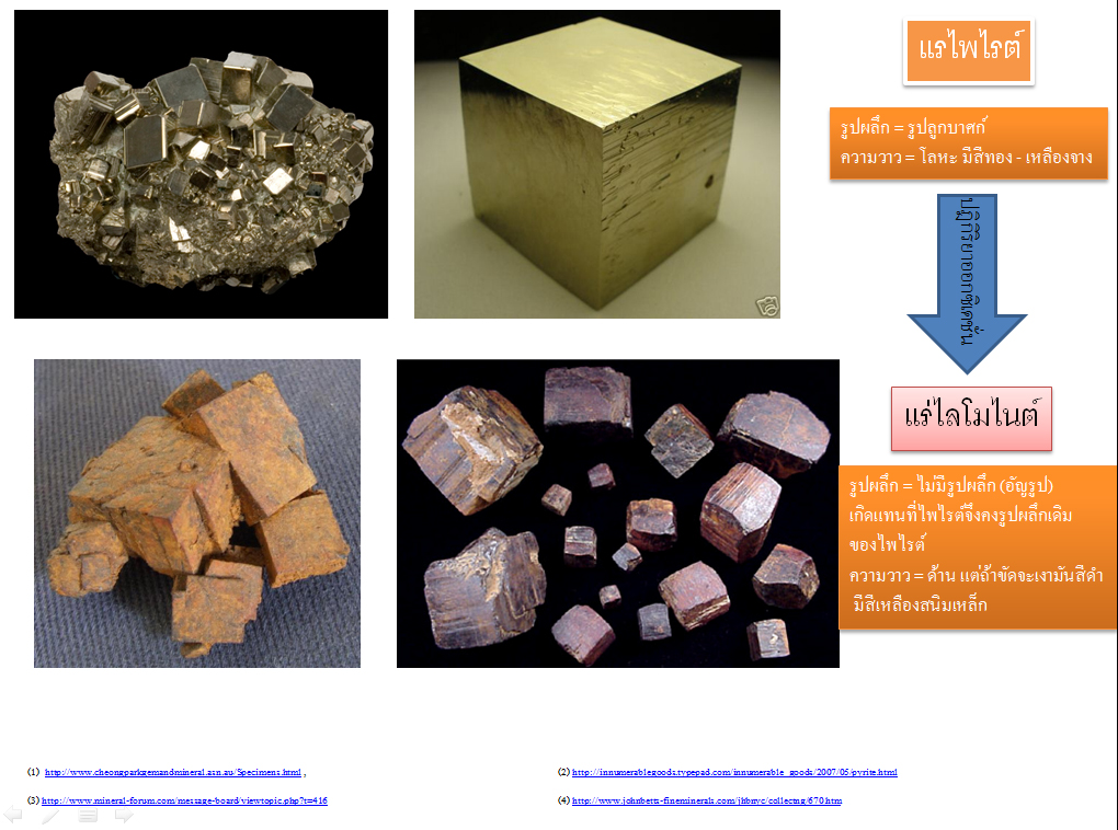 - ปฎิกิริยาออกซิเดชัน เป็นปฎิกิริยาที่ธาตุโลหะที่เป็นส่วนประกอบของแร่ ทำปฎิกิริยากับ ออกซิเจน เกิดเป็นแร่ใหม่ เช่น การเปลี่ยนของแร่แมกนีไทต์ ไปเป็นแร่ฮีมาไทต์ และการเปลี่ยนแปลงของแร่ไพไรต์ ไปเป็น ไลมอไนต์ (ข้าวตอกพระร่วง) เป็นต้น