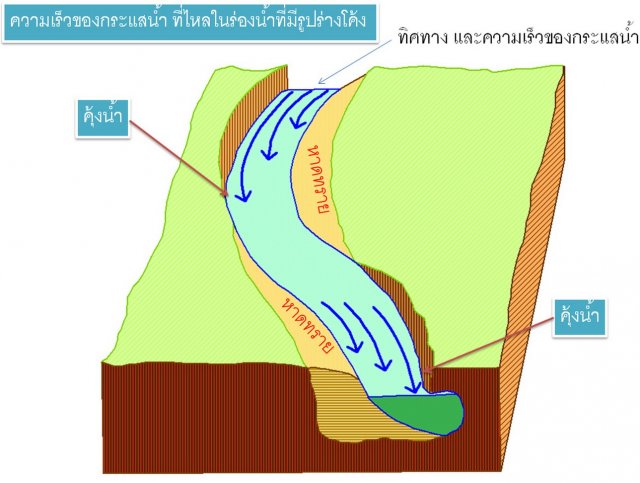 เมื่อน้ำไหลผ่านในบริเวณทางน้ำที่โค้ง ความเร็วของกระแสน้ำจะเพิ่มขึ้นบริเวณส่วนโค้งด้านนอกของทางน้ำ (คุ้งน้ำ) ส่วนบริเวณโค้งด้านในของทางน้ำ กระแสน้ำจะมีความเร็วลดลง