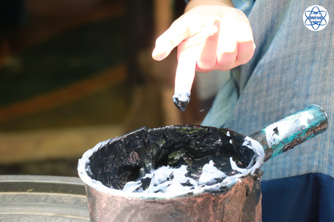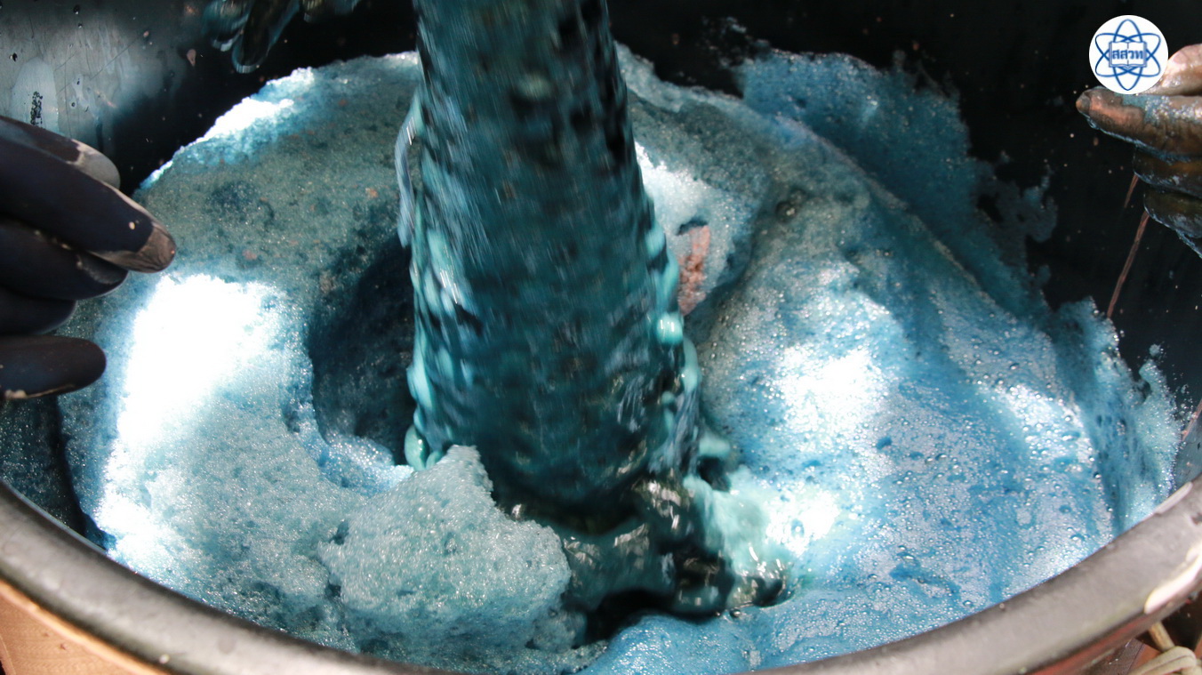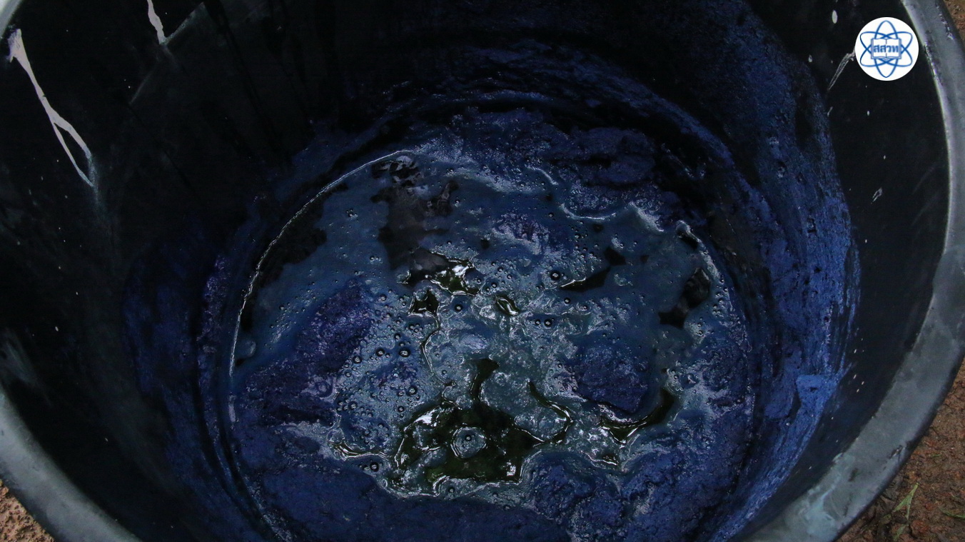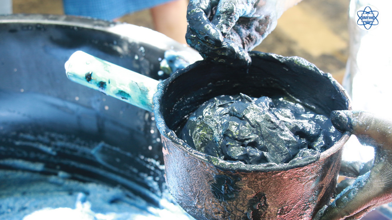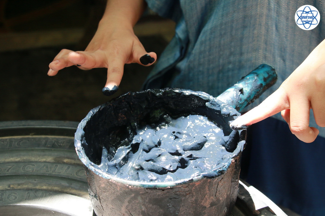 กวนน้ำครามและพักไว้ 1 คืน แยกได้เนื้อครามสีน้ำเงิน