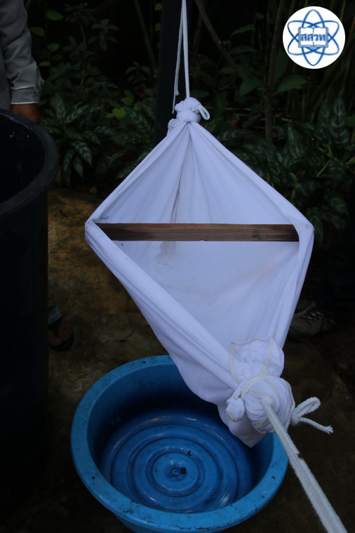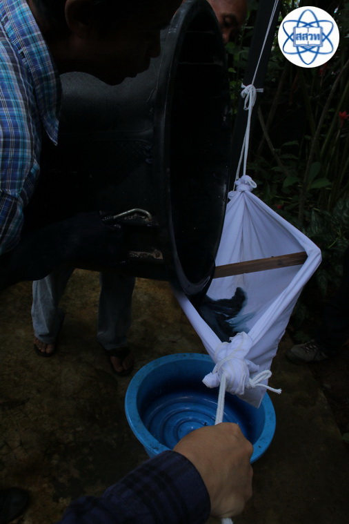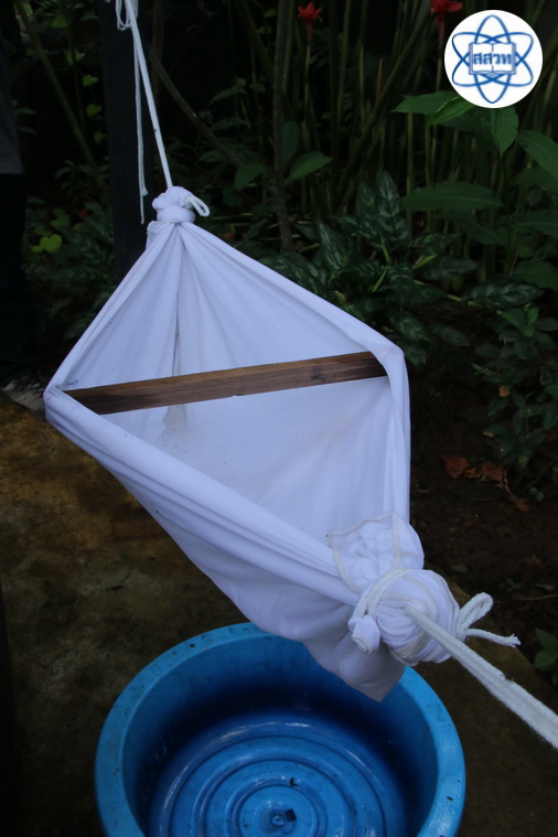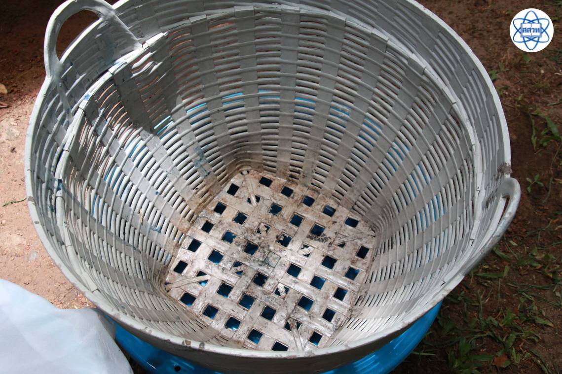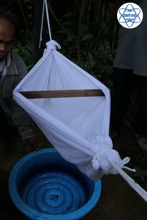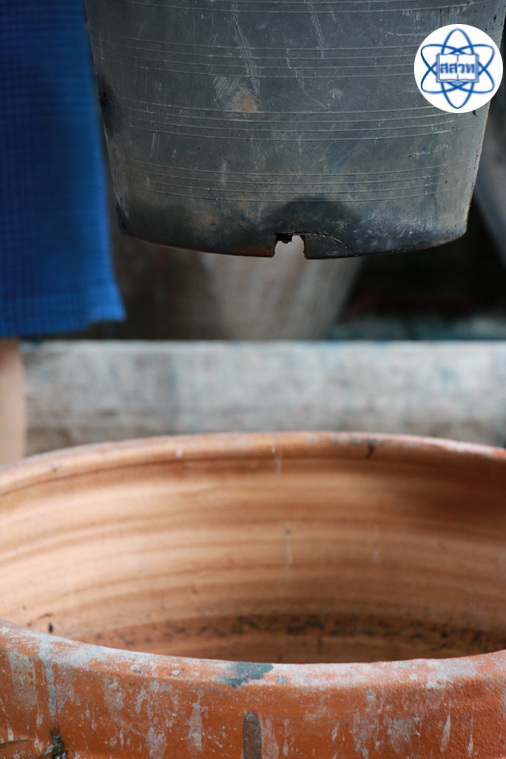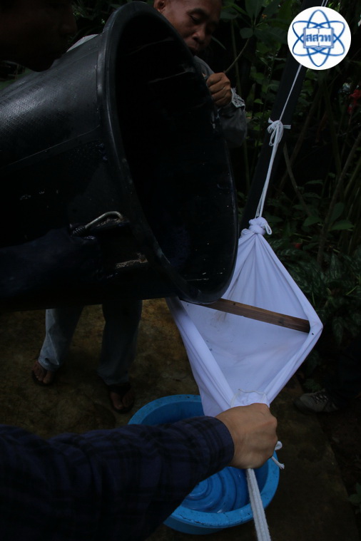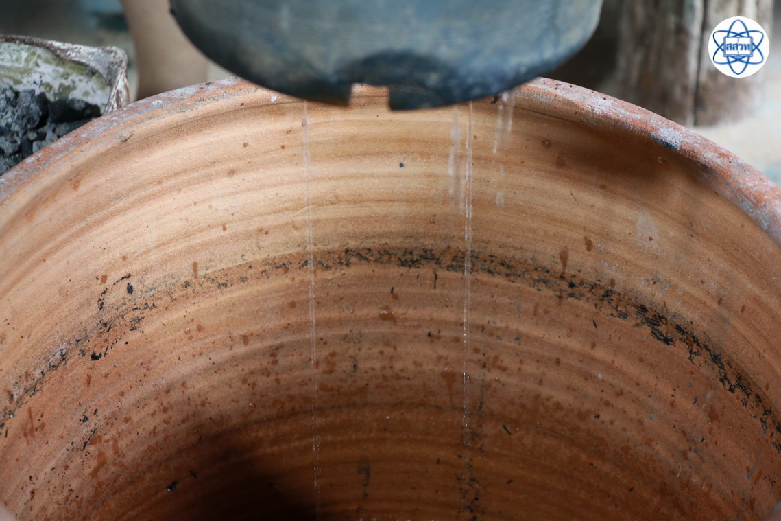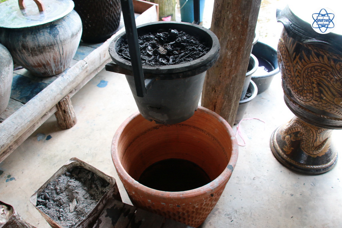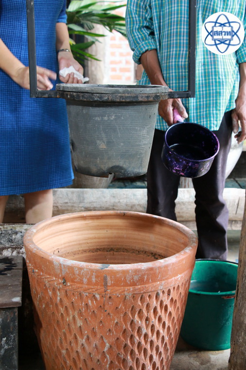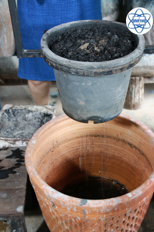 ซ้าย : ขี้เถ้าชื้น กลาง : กดอัดขี้เถ้าในถังกรอง ขวา : เทน้ำใส่ถังกรองและกรองน้ำขี้เถ้า