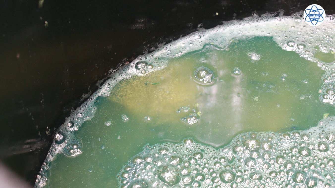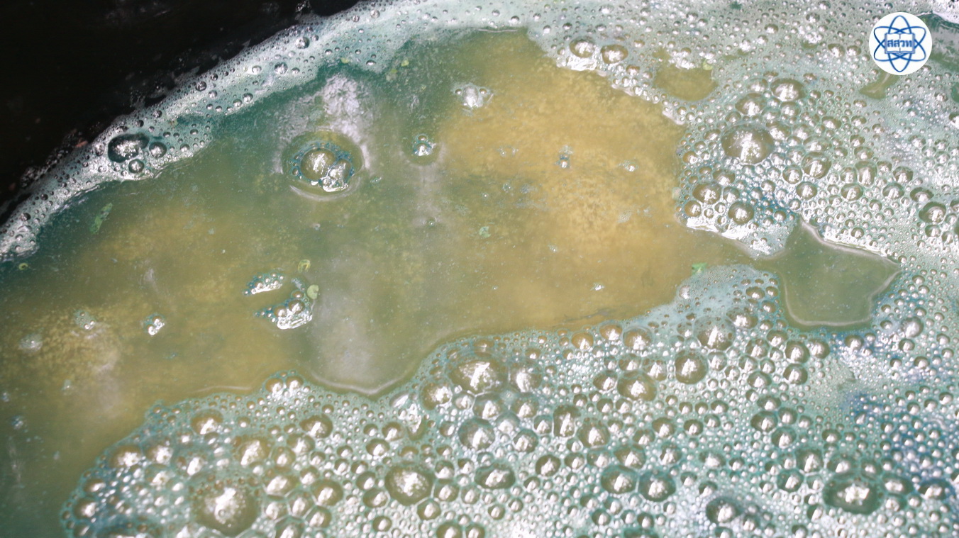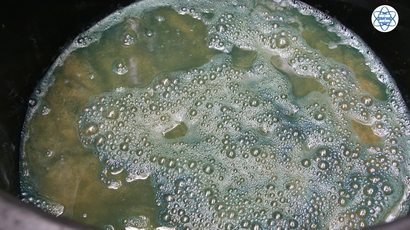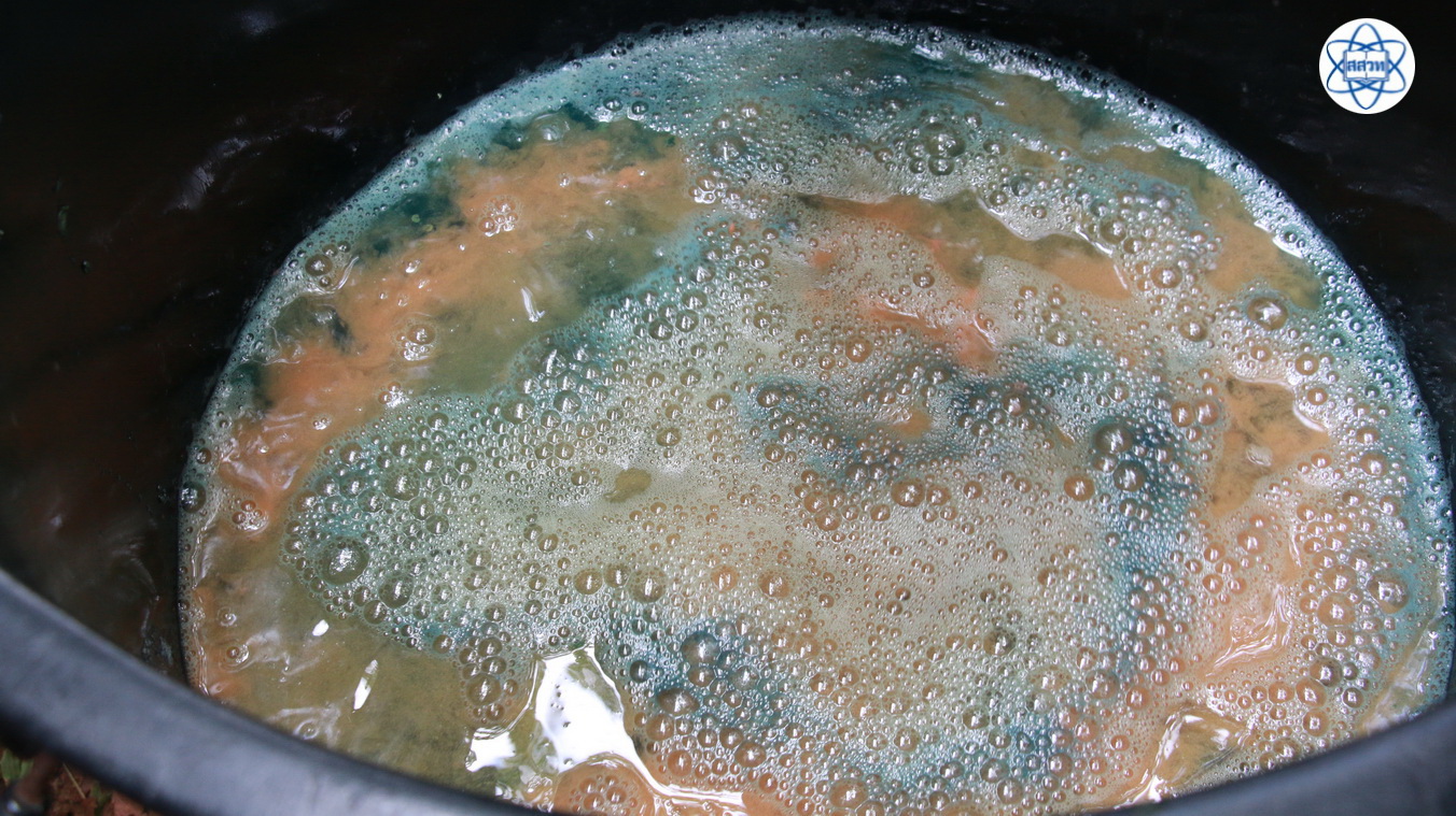 เติมปูนให้พอดี น้ำครามเปลี่ยนเป็นสีเหลือง ฟองสีน้ำเงิน