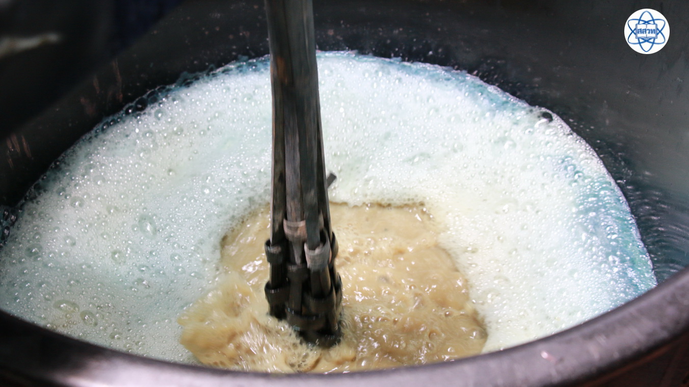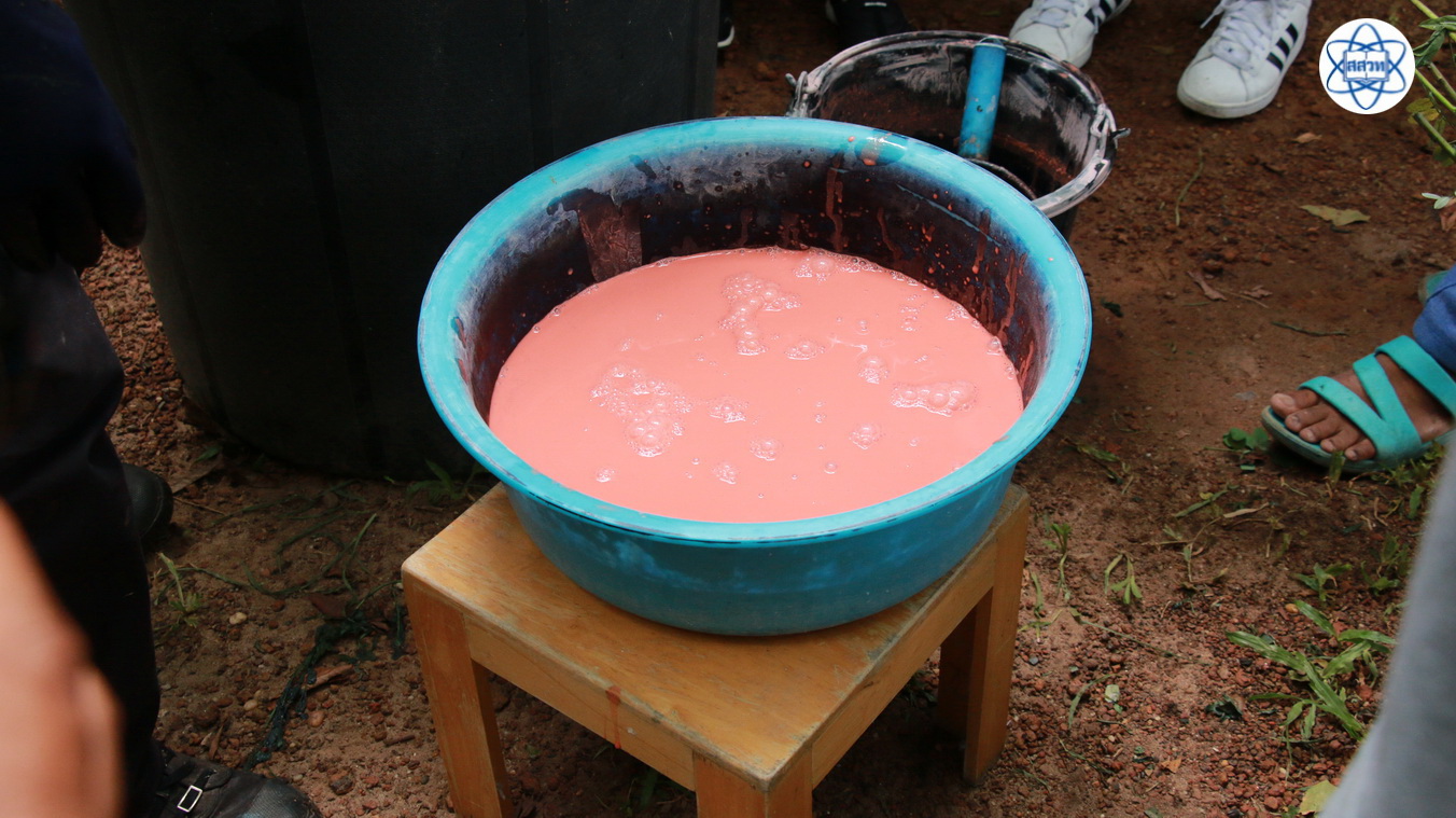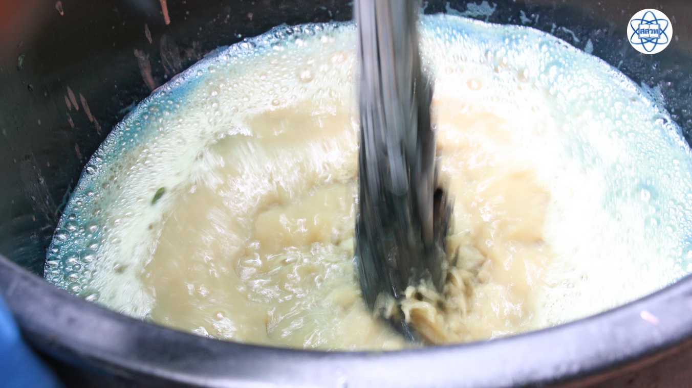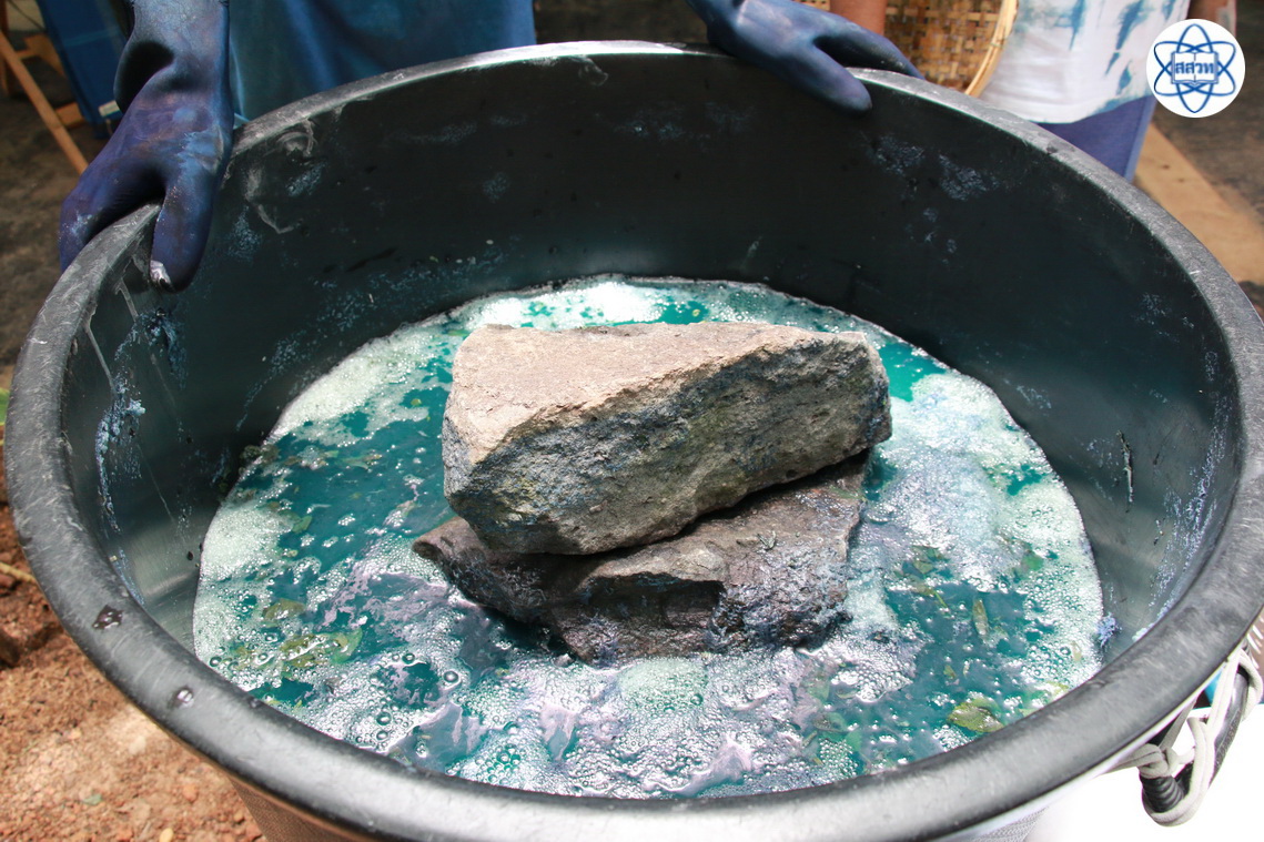 เติมปูนให้พอดี น้ำครามเปลี่ยนเป็นสีเหลือง ฟองสีน้ำเงิน