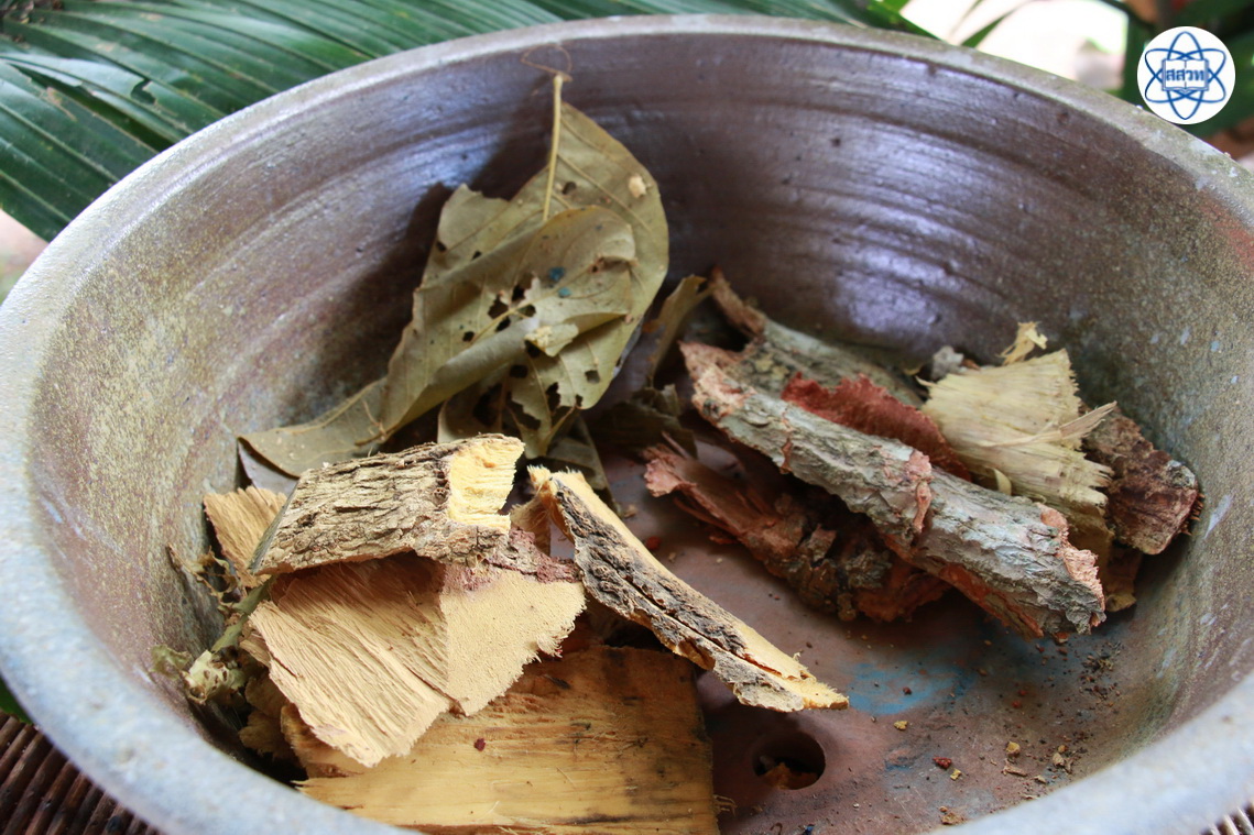 รูปที่ 10 วัตถุดิบของการก่อหม้อ และสีของน้ำย้อมที่พร้อมย้อมครั้งแรก