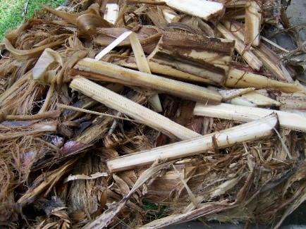 ซ้าย : ต้นและเหง้ากล้วย กลาง : เกสรตัวผู้ของตาล ขวา : กิ่งและใบมะขาม ต้นเพกา ทางมะพร้าว