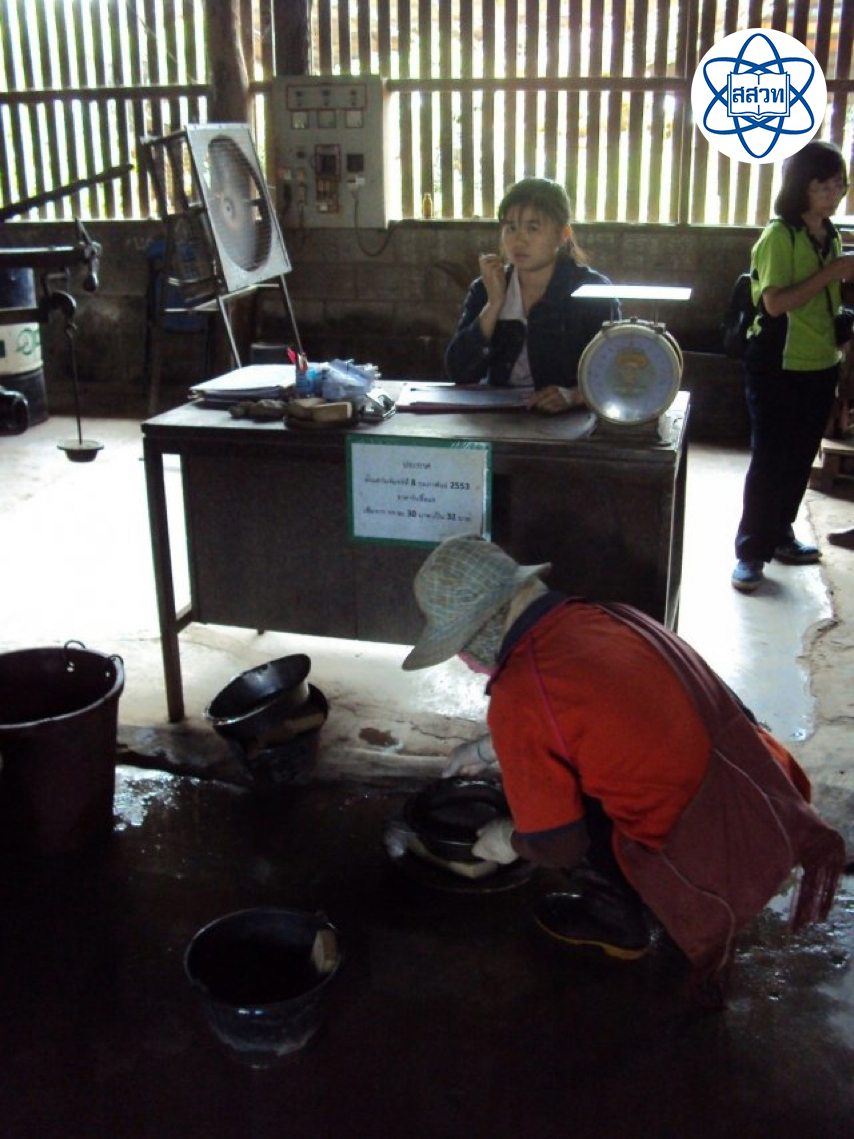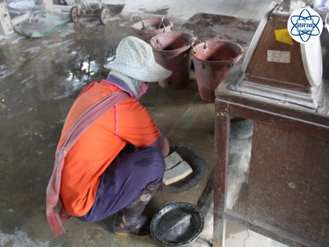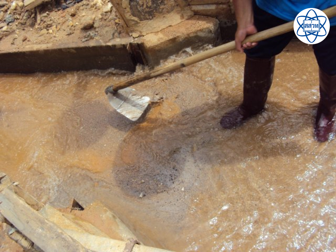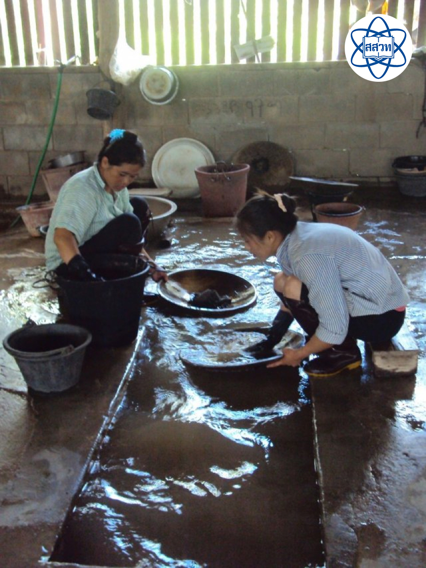 แร่ที่ขนมาจากรางกู้แร่จะเริ่มจากการล้างทำความสะอาดให้ดิน ทรายและเศษหินที่ติดมาหลุดออกไปจนหมด แล้วนำแร่ที่ผ่านการล้างทำความสะอาดแล้ว เข้าสู่กระบวนการต่อไป คือ การนำไปให้ความร้อนโดยใช้วิธีเดียวกับการคั่วในกระทะเหล็กขนาดใหญ่ จนแร่ทั้งหมดแห้งสนิท เรียกว่า การย่างแร่