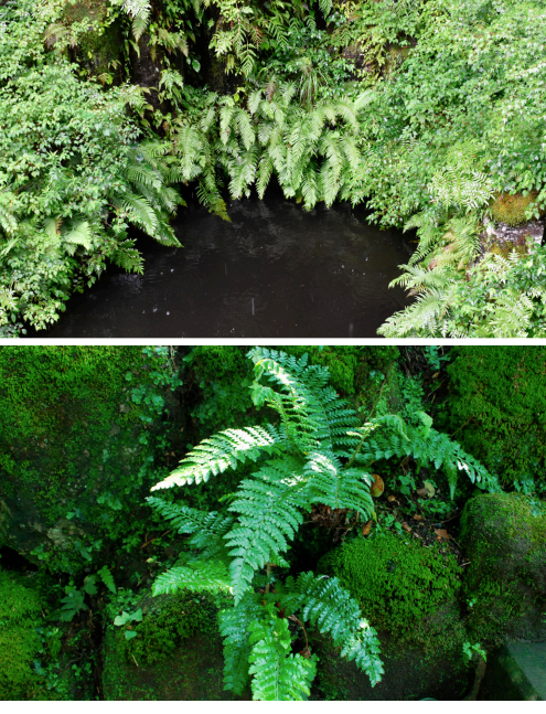 ภาพที่ 7 (บน) เฟิร์นชนิดต่าง ๆ บนช่องเขาทาคาชิโฮ (ล่าง) เฟิร์นขึ้นบนหิน
