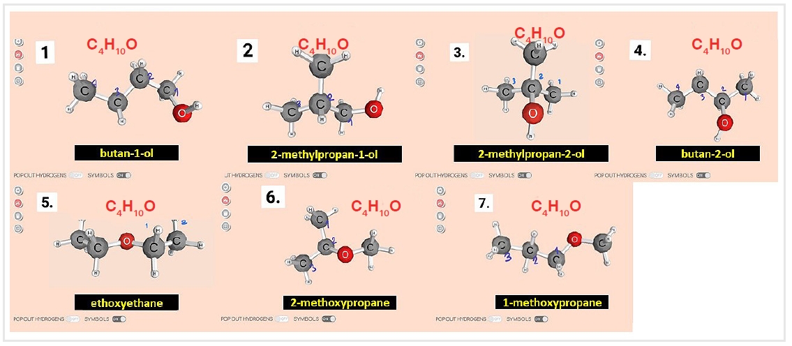 4. ครูถามคำถามเพิ่มเติมว่า "ถ้าครูเพิ่มธาตุ O 1 อะตอม เข้าไปในโมเลกุล C4H10 เป็น C4H10O นักเรียนคิดว่าโครงสร้างที่ได้จะแตกต่างจากเดิมอย่างไร และโครงสร้างที่เป็นไปได้มีทั้งหมดกี่แบบ" จากนั้นครูให้นักเรียนต่อโครงสร้างของโมเลกุล C4H10O และพิจารณาว่ามีโครงสร้างที่เป็นไปได้ทั้งหมดกี่แบบ ซึ่งได้ผลลัพธ์ดังภาพ 3