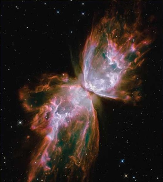 ในขั้นตอนสุดท้ายของวิวัฒนาการของดาวฤกษ์ สิ่งห่อหุ้มรอบนอกของดาวฤกษ์ (ที่มีลักษณะเดียวกันกับดวงอาทิตย์) จะถูกพัดออกไปยังตัวกลางระหว่างดาวฤกษ์ที่อยู่รอบ ๆ เหลือไว้เพียงแกนกลางที่ร้อนและไม่มีอะไรห่อหุ้ม ภาพนี้แสดงถึงเนบิวลาดาวเคราะห์ โดยรังสีเหนือม่วงที่แผ่ออกจากแกนกลางให้ความสว่างกับแก๊สและฝุ่นที่ถูกขับออกไป ก่อเป็นรูปร่างซึ่งเป็นที่มาของชื่อ “เนบิวลาผีเสื้อ (Butterfly Nebula)” ในอนาคตเนบิวลานี้จะเหลือเพียงแกนกลางของดาวฤกษ์ตั้งต้นที่เผาไหม้ไฮโดรเจนเท่านั้น ที่เราเรียกว่า ดาวแคระขาว