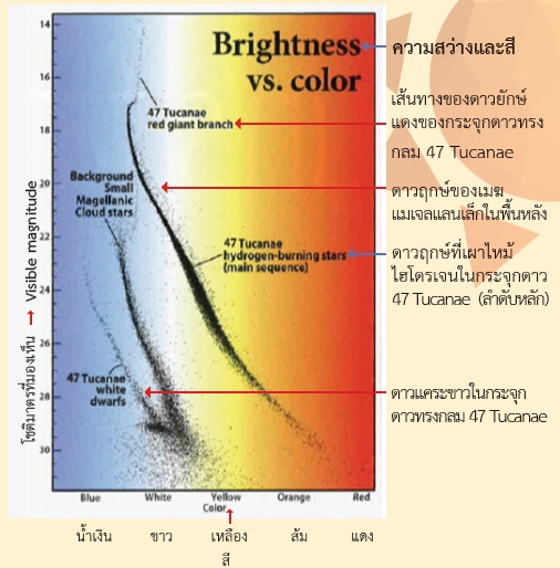 แผนภูมิเฮิรตซ์สปรุง-รัสเซลล์แสดงความสว่างของดาวฤกษ์ในกระจุกดาวทรงกลม 47 Tucanae ตามแกน Y และสีของดาว (ซึ่งสอดคล้องกับอุณหภูมิ) ตามแกน X ข้อมูลแสดงถึงประชากร 3 กลุ่มภายในกระจุกดาวทรงกลมรวมถึงดาวฤกษ์ที่เผาไหม้ไฮโดรเจนในกาแล็กซีแคระ (เมฆแมเจลแลนเล็ก) ที่อยู่บนพื้นหลัง กาแล็กซีนี้อยู่ห่างจาก 47 Tuc ออกไปทางด้านหลัง 200,000 ปีแสง