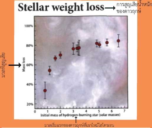สูญเสียมวลไปมากเท่าใด ภายหลังจากที่ใช้การคำนวณนี้กับสิ่งที่สังเกตได้จากดาวแคระขาวในกระจุกดาวใกล้เคียงเป็นเวลานับหลายทศวรรษ รวมถึงผลที่ได้จากการศึกษา 47 Tuc ของคาลิไรและคณะ ทำให้ค้นพบว่าดาวฤกษ์ที่เผาไหม้ไฮโดรเจนจะสูญเสียมวลของมันไปมาก ในวิวัฒนาการของดาวฤกษ์ ดาวฤกษ์ที่มีมวลมากกว่าก็จะสูญเสียมวลสารมากเป็นสัดส่วนกัน ตัวอย่างเช่น ดาวฤกษ์ที่ถือกำเนิดโดยมีมวลห้าเท่าของมวลดวงอาทิตย์จะสูญเสียมวลร้อยละ 80 ในวิวัฒนาการ และจบชีวิตลงในรูปของดาวแคระขาวมวลมาก โดยมีมวลเท่ากับมวลของดวงอาทิตย์โดยประมาณ (ดาวซิริอุส บี ซึ่งเป็นดาวแคระขาวที่อยู่ใกล้ดวงอาทิตย์มากที่สุด สอดคล้องกับการทำนายนี้เนื่องจากมันมีมวลโดยประมาณเท่ากับดวงอาทิตย์) ดาวฤกษ์ที่มีขนาดใหญ่เช่นนี้พบได้น้อยกว่า เนื่องจากธรรมชาติสร้างดาวฤกษ์มวลน้อยเป็นจำนวนมากกว่าดาวฤกษ์มวลมากอยู่มาก