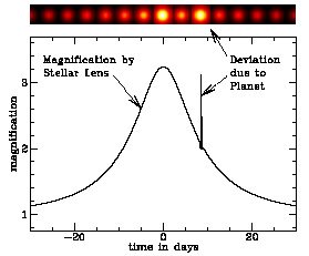 เลนส์ความโน้มถ่วง จะเกิดขึ้นเมื่อแสงจากวัตถุที่อยู่ด้านหลังโค้ง เนื่องจากแรงดึงดูดจากวัตถุที่อยู่ด้านหน้า ในอดีตปรากฏการณ์นี้ ใช้ศึกษาแสงจากกาแลคซีที่จางและอยู่ไกล ซึ่งแสงจะโค้งเข้าหาอีกอันหนึ่ง เมื่อไม่นานมานี้ อุปกรณ์ที่มีประสิทธิภาพสามารถพบปรากฏการณ์นี้ของดาวในบริเวณกลางกาแลคซีของ เรา กราฟแสง (light curve) จากความโน้มถ่วงของดาว (stellar lensing) จะเรียบ ดังนั้น เมื่อมันมีดาวเคราะห์ที่สว่างพอ ซึ่งเคลื่อนที่หลังเลนส์ ก็จะเกิดการรบกวนแสงดาว ดังภาพด้านล่าง