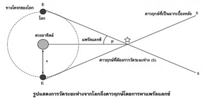 รูปแสดงการวัดระยะห่างจากโลกถึงดาวฤกษ์โดยการหาแพรัลแลกซ์