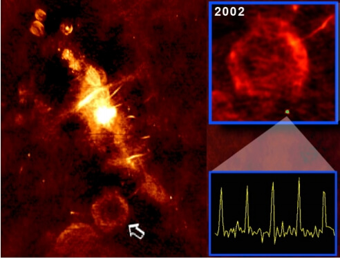 ใจกลางกาแล็กซีทางช้างเผือกในช่วงคลื่นวิทยุ เผยให้เห็นโครงสร้างที่ถูกแสงและฝุ่นระหว่างดาวบดบัง อย่างซากซูเปอร์โนวาและแหล่งกำเนิดคลื่นวิทยุที่ปลายลูกศร (ภาพอนุเคราะห์โดย NRL/SBC Galactic Center Radio Group)