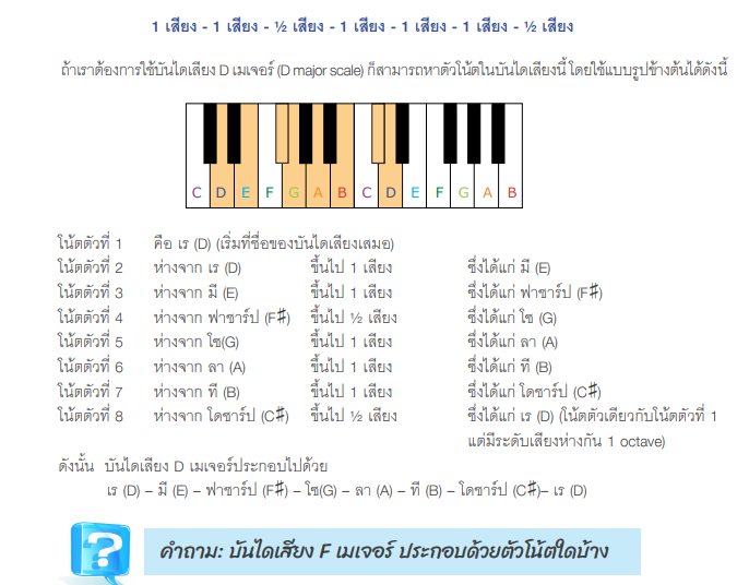 ชุดของตัวโน้ตหลัก 7 ตัวที่เรารู้จักนั้น เมื่อนำมาเรียงต่อกันเป็น ใด (C) - เร (D) - มี (E) - ฟา (F) -โซ (G) - ลา (A) - ที (B) -โด (C เรียกว่า "บันไดเสียง C เมเจอร์ (C major scale)" และเมื่อพิจารณาความห่างของโน้ตแต่ละคู่ที่อยู่ติดกันในบันไดเสียงดังกล่าว โดยพิจารณาเทียบกับภาพที่ 1 จะได้แผนภาพดังต่อไปนี้