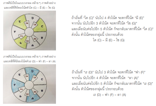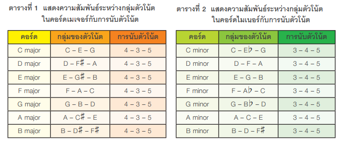 กลุ่มของตัวโน้ตที่หได้จากวิธีการดังกล่าวสอดคล้องกับกลุ่มของตัวโน้ตที่เรียกว่า คอร์ดเมเจอร์ (major chord) และ คอร์ดไมเนอร์ (minor chord ในดนตรีตะวันตกดังนี้