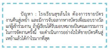 - ระบุคำถามที่เกี่ยวข้องกับปัญหางานคืนสู่เหย้า เช่น บัตร์คืนสู่เหย้ามีราคาเท่าใดบ้างบัตรคืนสู้เหย้าแต่ละใบมีราคาเท่ากันหรือไม่มูลค่าของรางวัลเป็นเท่าใดบ้างมี้ค่าใช้จ่ายในการดำเนินการอื่น ๆ เพิ่มเติมหรือไม่