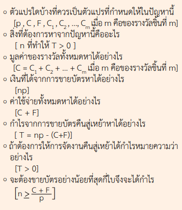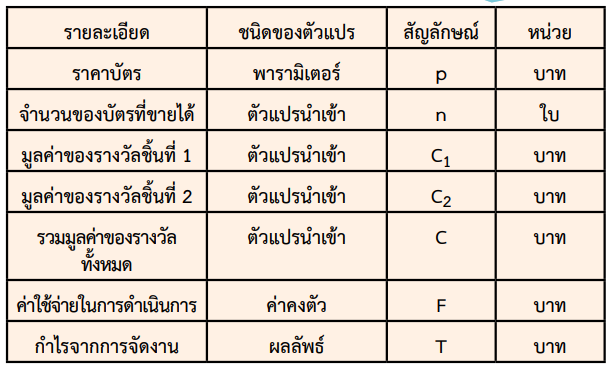 - ระบุและบอกชนิดของตัวแปรที่เกี่ยวข้องกับปัญหา เช่นราคาบัตร จำนวนบัตรที่ขายได้ มูลค่าของรางวัลและค่าใช้จ่ายในการดำเนินการ โดยแจกแจงรายละเอียดของตัวแปรต่าง ๆ ดังแสดงในตาราง