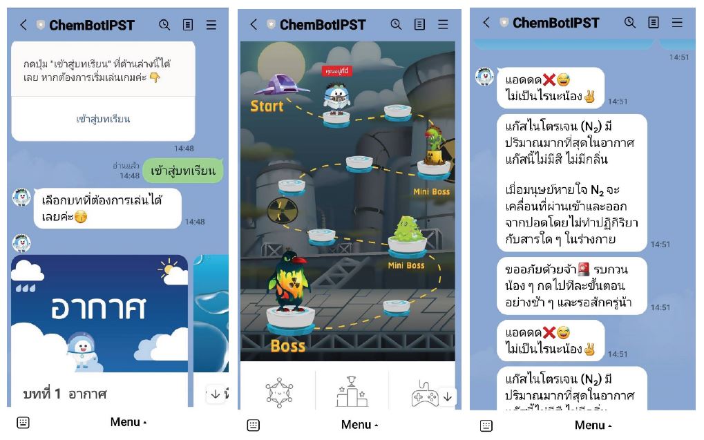 ตัวอย่างแชทบอทที่ สสวท. พัฒนาขึ้นมีทั้งวิชาที่พัฒนาเรียบร้อยแล้ว พร้อมใช้งานและวิชาที่กำลังอยู่ระหว่างการดำเนินงานเป็นสิ่งที่ครูสามารถนำไปใช้ช่วยในการจัดการเรียนการสอนได้ แม้ว่าระบบต่างๆ ยังไม่ครบสมบูรณ์ แต่ก็สามารถพัฒนาต่อในภายหลังจนเป็นแชทบอทที่มีความสามารถครบตามที่กล่าวไว้ข้างต้นได้ ในวิชาเคมีได้พัฒนาแชทบอทในไลน์แอปพลิเคขันที่ชื่อ ChemBotIPST (เคมบอทไอพีเอสที) ครูและนักเรียนสามารถเพิ่มเป็นเพื่อนและเข้าไปลงทะเบียนและใช้บอทนี้ในการช่วยการจัดการเรียนรู้ของนักเรียนได้ รายละเอียดบทเรียนจะสอดคล้องกับหลักสูตรแกนกลางการศึกษาขั้นพื้นฐาน พุทธศักราช 2551 (ฉบับปรับปรุง พ.ศ. 2560) มีการเลือกเนื้อหาบทเรียนที่ตรงกับความต้องการของผู้เรียน มีลำดับการเรียนรู้ มีแบบฝึกหัดของแต่ละบทเรียน ซึ่งเมื่อตอบผิดจะมีคำอธิบายเพิ่มเติม นักเรียนสามารถเรียนรู้ด้วยตนเองได้