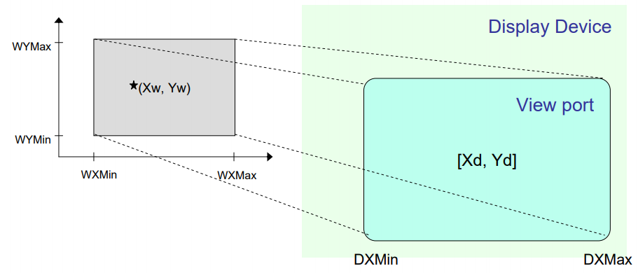 ในการเขียนโปรแกรมให้เกิดการแสดงผลผ่านจออุปกรณ์คอมพิวเตอร์ ส่วนต่าง ๆ ของภาพจะถูกนำมาแสดงบนจอภาพได้โดยการนำ window ไปวางไว้ตรงส่วนนั้นของภาพในระบบพิกัดโลก การปรับเปลี่ยน ขนาดของหน้าต่างจะทำให้เกิด การย่อ การขยาย หรือการบิดเบี้ยวของภาพ ซึ่งอยู่ในหน้าต่างได้เราต้องแปลง