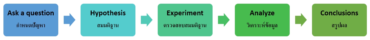เราจะเห็นภาพรวมของกระบวนการทางวิทยาศาสตร์ที่มีขั้นตอนหลัก 5 ข้อ ได้แก่