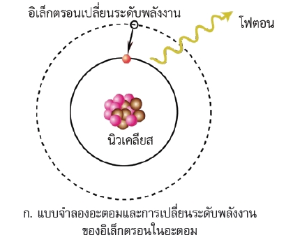 ก. แบบจำลองอะตอมและการเปลี่ยนระดับพลังงานของอิเล็กตรอนในอะตอม |