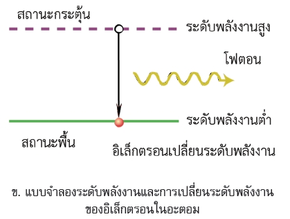 ข. แบบจำลองระดับพลังงานและการเปลี่ยนระดับพลังงานของอิเล็กตรอนในอะตอม |