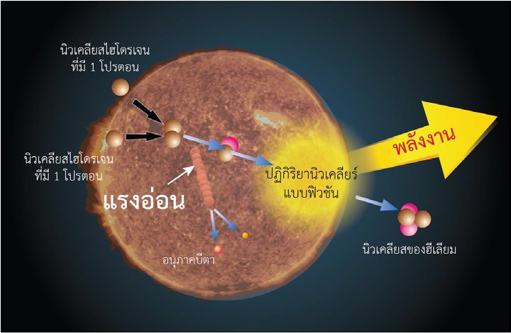ถึงแม้ว่าแรงอ่อนจะเกี่ยวข้องกับอนุภาคที่มีขนาดเล็กมาก ๆ แต่ผลของแรงอ่อนทำให้เกิดการสลายของนิวเคลียส ไฮโดรเจนที่เป็นกลไกสำคัญของการเกิดปฏิกิริยานิวเคลียร์แบบฟิวชันบนดวงอาทิตย์ ดังภาพ 8 ถ้าไม่มีแรงอ่อน กระบวนการที่ทำให้มีการปลดปล่อยพลังงานบนดวงอาทิตย์ จะไม่สามารถเกิดขึ้นได้ และคงไม่มีแสงและพลังงานจากดวงอาทิตย์ มาหล่อเลี้ยงสิ่งมีชีวิตบนโลก