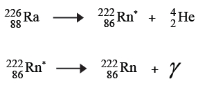 ที่มีเสถียรภาพมากขึ้น แต่ยังที่มีเสถียรภาพมากขึ้น แต่ยังอยู่ในสถานะกระตุ้น และต่อมานิวเคลียสของเรดอน-222 ที่อยู่ในสถานะกระตุ้น จะมีการสลายพร้อมกับปล่อยรังสีแกมมา (