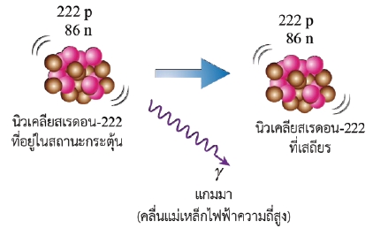 ภาพ 2 นิวเคลียสที่ไม่เสถียรมีการสลายเพื่อเปลี่ยนไปอยู่ในสภาวะที่เสถียรกว่าพร้อมปล่อยรังสีออกมา