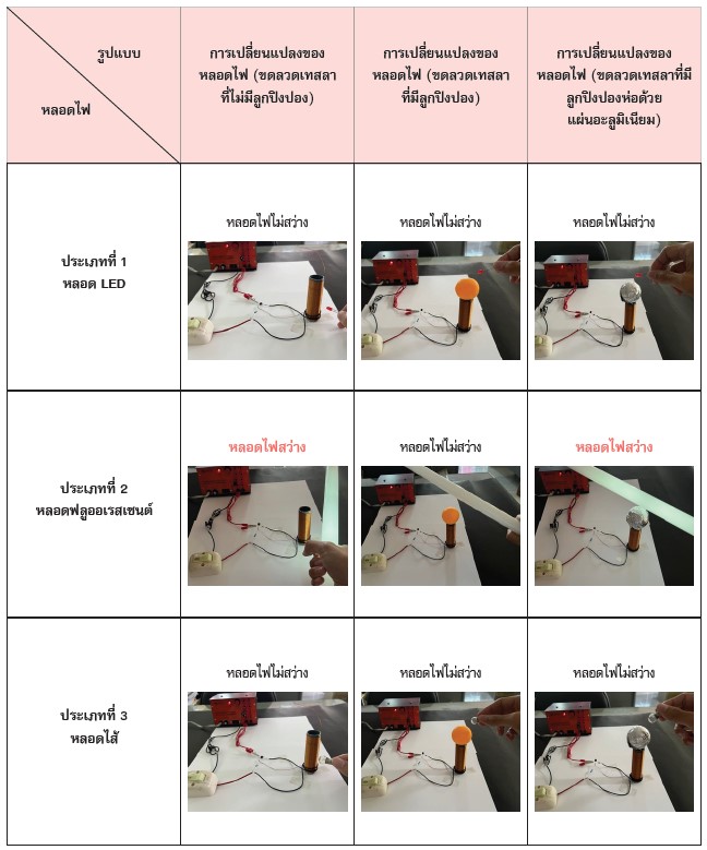 4. นำแผ่นอะลูมิเนียมห่อลูกปิงปอง สอดสายลวดทองแดงที่อยู่ปลายขดลวดเทสลาเข้าไปในแผ่นอะลูมิเนียมด้วย แล้ววางบนขดลวดเทสลา นำหลอดไฟ 3 รูปแบบ มาใกล้ขดลวดเทสลาบริเวณด้านบนลูกปิงปอง สังเกตการเปลี่ยนแปลงแล้วบันทึกผล
